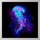 Large, blue, artistically drawn, glowing, bright jellyfish, with long tentacles on black background with purple bioluminescence. Luminous jellyfish.