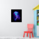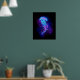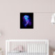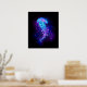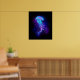 Large, blue, artistically drawn, glowing, bright jellyfish, with long tentacles on black background with purple bioluminescence. Luminous jellyfish.