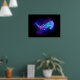 Large, blue, artistically drawn, glowing, bright jellyfish, with long tentacles on black background with purple bioluminescence. Luminous jellyfish.