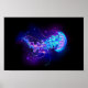 Large, blue, artistically drawn, glowing, bright jellyfish, with long tentacles on black background with purple bioluminescence. Luminous jellyfish.