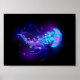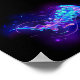 Large, blue, artistically drawn, glowing, bright jellyfish, with long tentacles on black background with purple bioluminescence. Luminous jellyfish.