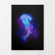 Large, blue, artistically drawn, glowing, bright jellyfish, with long tentacles on black background with purple bioluminescence. Luminous jellyfish.