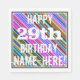 This fun birthday-themed paper napkin design features a message like "HAPPY 29th BIRTHDAY, NAME-HERE!", where the name can be customised. The background features a vibrant, multicolored stripes pattern. The message text is coloured white, and has a distressed appearance. Napkins like these could perhaps be used at a birthday party for somebody who is celebrating their twenty ninth birthday. [~Z0000270]