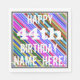 This fun birthday-themed paper napkin design features a message like "HAPPY 44th BIRTHDAY, NAME-HERE!", where the name can be customised. The background features a vibrant, multicolored stripes pattern. The message text is coloured white, and has a distressed appearance. Napkins like these could perhaps be used at a birthday party for somebody who is celebrating their forty fourth birthday. [~Z0000270]