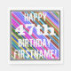 This fun birthday-themed paper napkin design features a message like "HAPPY 47th BIRTHDAY, FIRSTNAME!", where the name can be customised. The background features a vibrant, multicolored stripes pattern. The message text is coloured white, and has a distressed appearance. Napkins like these could perhaps be used at a birthday party for somebody who is celebrating their forty seventh birthday. [~Z0000270]