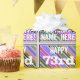 This fun birthday-themed wrapping paper design features a message like "HAPPY 73rd BIRTHDAY, NAME-HERE!", where the name can be customised. The background features a vibrant, multicolored stripes pattern. The message text is coloured white, and has a distressed appearance. Wrapping paper like this could perhaps be used when wrapping gifts or presents being given to somebody who is celebrating their seventy third birthday. [~Z0000272]
