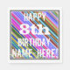 This fun birthday-themed paper napkin design features a message like "HAPPY 8th BIRTHDAY, NAME-HERE!", where the name can be customised. The background features a vibrant, multicolored stripes pattern. The message text is coloured white, and has a distressed appearance. Napkins like these could perhaps be used at a birthday party for somebody who is celebrating their eighth birthday. [~Z0000270]