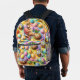 Hop into the festive season with this incredibly cheerful and colorful Easter themed backpack this eye-catching design features a joyful leaping bunny carrying a giant decorated egg surrounded by a whimsical world of pastel patterns spring flowers and baskets overflowing with Easter treats with its high energy all over print this backpack captures the magic of a springtime egg hunt in every detail