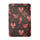 Vibrant red birds with detailed patterns are set against a black background, surrounded by intricate floral and leafy designs, creating a lively, ornamental scene.