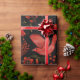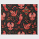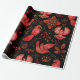 Vibrant red birds with detailed patterns are set against a black background, surrounded by intricate floral and leafy designs, creating a lively, ornamental scene.