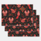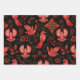 Vibrant red birds with detailed patterns are set against a black background, surrounded by intricate floral and leafy designs, creating a lively, ornamental scene.
