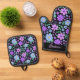 This oven mitt set features a vibrant botanical design with blue, purple and violet flowers with leaves on a black background. Personalise it with a name.