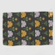 A striking pattern featuring yellow and purple flowers with green stems and leaves on a black background.
