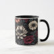 The image showcases a stunning floral pattern with a variety of flowers in shades of white, red, and orange against a black background. Each flower is intricately detailed, with fine lines and shading that create depth and texture. The central flowers are prominent with their large petals, while the surrounding smaller flowers and leaves add complexity and richness to the overall design. The leaves are depicted in different shades of green and Gray, adding contrast and balance to the colorful blossoms.