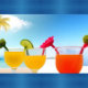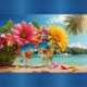 A vibrant beach scene capturing the colourful arrangement of flowers and drinks in the foreground while revealing the serene ocean and palm trees in the background.