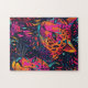 Dive into a vibrant jungle oasis with this colorful puzzle. This design showcases the majestic heads of two distinct leopards, their orange and yellow coats vivid against a lush, dark canvas. The leopards’ rosette markings are unmistakable, and whimsical touches of blue, green, and pink add an artistic flair to the overall look. This jigsaw puzzle is perfect for those who love a challenge, wild animals and bright, vivid colors.