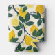 The pattern features a lively and vibrant design with lush lemon trees. The branches are adorned with ripe, bright yellow lemons, some of which are sliced open to reveal their juicy interiors. The lemons are surrounded by deep green leaves, which contrast beautifully with the warm, cream-coloured background. The overall style is bold and stylised, with clean lines and a sense of symmetry, creating a fresh and cheerful aesthetic that evokes a Mediterranean vibe.