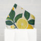 The pattern features a lively and vibrant design with lush lemon trees. The branches are adorned with ripe, bright yellow lemons, some of which are sliced open to reveal their juicy interiors. The lemons are surrounded by deep green leaves, which contrast beautifully with the warm, cream-coloured background. The overall style is bold and stylised, with clean lines and a sense of symmetry, creating a fresh and cheerful aesthetic that evokes a Mediterranean vibe.