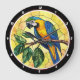 A colourful clock featuring a macaw parrot illustrated in a stained glass pattern, perched on a branch amidst tropical leaves. The artwork evokes a cheerful ambiance, perfect for vibrant home decor.