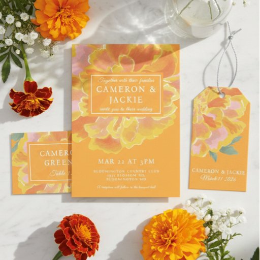 Vibrant and bright these marigold wedding invites are perfect for spring and summer weddings! These can be customized to change the base background color.
