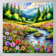Colourful meadow showcasing a variety of wildflowers and a gentle stream flowing through, surrounded by trees and mountains. Captures nature's vibrant beauty, serenity, and tranquillity.