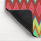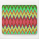 Vibrant mouse pad with bold, multicolored zigzag pattern featuring red and green diamond shapes. A white mouse rests on it, creating a dynamic, lively vibe.