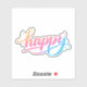 A cheerful and modern "happy" design featuring a beautiful flowing script with a vibrant pastel gradient of orange, pink, and blue. Decorative sparkles and dots add a touch of magic and positivity to this clean, uplifting artwork.