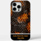 The close-up reveals a stunning array of snake skins, showcasing an intricate interplay of vibrant colours. The glossy surface highlights the unique scales, with hues of deep black and vivid orange blending seamlessly. MONOGRAM ADD YOUR NAME