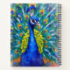 A vibrant peacock in colours of blue, green, yellow and orange. His tail feathers spread to show his style.