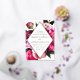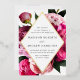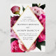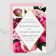 Elegant floral wedding invitations featuring your wedding details inside of a gold foil diamond frame surrounded by beautiful vivid pink and blush pink peonies with lush green leaves. The gold foil and peony wedding invitations reverse to a light pink background with space for additional text and images.