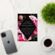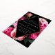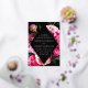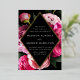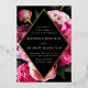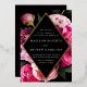 Elegant floral wedding invitations featuring your wedding details inside of a gold foil diamond frame with a black background. Beautiful vivid pink and blush pink peonies with lush green leaves. The gold foil and peony wedding invitations reverse to a black background with space for additional text and images.
