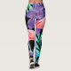 Bold and bright, tropical print leggings, feature flamingos and palm leaves, against a background of purple, blue and black.