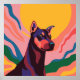 This is a vibrant pop art style digital illustration of a Doberman Pinscher's portrait. The dog is depicted with bold, flat areas of color in shades of black, blue, purple, and red, creating a striking and modern aesthetic. Its eyes are yellow, and it has a focused, alert expression. The Doberman is set against a colorful abstract background with a large yellow circle, possibly representing the sun, and wavy shapes in shades of pink, blue, green, and yellow, suggesting a stylized landscape. The overall style is reminiscent of pop art, with its use of strong colors and simplified forms. The artwork captures the noble and alert nature of the Doberman in a contemporary and eye-catching manner.