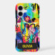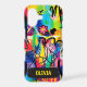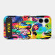 This colorful personalized phone case features a high-energy abstract art composition combining bold colors, dripping paint, scribbled lines, and elements of graffiti and pop art.