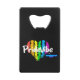 Unleash your pride with the Vibrant PrideVibe credit card bottle opener by Sarendestini Designs. Featuring the bold Rainbow Heart PrideVibe logo on a sleek black background, this compact and stylish opener combines functionality with a statement of inclusivity. Easily fitting in your wallet or pocket, it’s perfect for on-the-go pride and practical use at any celebration. Elevate your drink-opening experience with this vibrant and meaningful accessory.