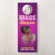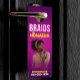 Promote your braiding expertise with this stylish and customisable Door Hanger template! Showcase your services, from box braids and knotless braids to wig making and styling, on the front. The back features a bold design perfect for highlighting your brand. Easily edit the text, photos, and fonts to match your unique style.