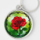 Vibrant red rose is centred within an ornate black frame, set against a soft green blurred background, creating a striking contrast that highlights the beauty of the flower.