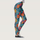 Bright orange, yellow, and purple flowers on a retro, mid-century modern background of teal squares, red-orange and pink dots, and white space-age stars create a fabulous pair of leggings.