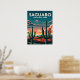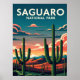 A stylised illustration of a desert sunset over Saguaro National Park, featuring prominent saguaro cacti and dramatic clouds.