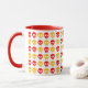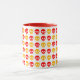 Pattern of red, orange, and yellow skulls on a white mug.