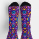 Vibrant socks with a kaleidoscope design feature bold purple, blue, yellow, and orange patterns. Black heels and toes add contrast, creating a lively, energetic vibe.