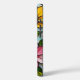 This lively image showcases a stained glass-style panel featuring several stylised flowers. Two bright yellow flowers and a soft pink one dominate the scene, surrounded by green leaves and swirling stems, all outlined with thick black lines. The background is a textured blend of light blues and whites, completing the stained glass effect and adding to the artwork's cheerful vibrancy.