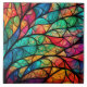 A mesmerising stained-glass-inspired abstract design featuring intricate leaf-like patterns in a spectrum of rich, glowing colours. The interplay of reds, blues, greens, and yellows creates a dynamic and harmonious composition, reminiscent of a radiant autumn tree or a kaleidoscopic mosaic. Perfect for decorative ceramic tiles, trivets, or artistic prints to bring elegance and energy to any space.