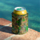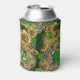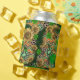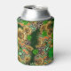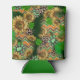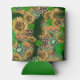 The image shows a can cooler with a vibrant and eclectic design. The pattern features large, detailed sunflowers with yellow petals and brown centres scattered across the surface. Interspersed among the sunflowers are green shamrocks, adding a touch of luck and Irish charm to the design. The background is a mix of animal print, specifically leopard spots, and zigzag chevron stripes in shades of green, orange, and beige. There are also clusters of green gemstones that add a sparkling effect to the overall look. The combination of these elements creates a lively and eye-catching aesthetic, making the can cooler both interesting and unique.