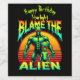 A bold green alien stands against a glowing, colourful sunset, exuding strength and mystery. Smaller alien figures nearby add depth to the captivating scene. The vibrant hues reflect in the water, blending extraterrestrial intrigue with the serene beauty of nature in a mesmerising visual experience.