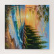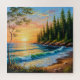 A colourful and serene scenic oil painting view of an ocean sunset with waves near a forested coastline and a vibrant sky, evoking tranquillity and the beauty of nature.