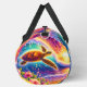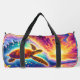 This colourful design duffel bag showcases a vibrant and artistic colourful pattern of a swimming sea turtle amidst a breathtaking sunset and ocean waves. It's a stylish and functional travel accessory, perfect for anyone seeking an expressive and unique design in their carrying bag.