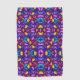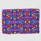 Vibrant towel featuring a symmetrical pattern of purple, blue, and yellow abstract shapes. The design conveys a lively and colorful tone.