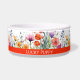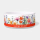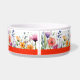 This vibrant watercolor wildflowers custom dog bowl showcases a pattern with lively mix of purple, orange, and red jewel-toned blooms, paired with sleek modern typography.