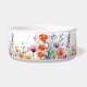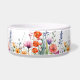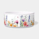 This vibrant watercolor wildflowers floral dog bowl showcases a pattern with lively mix of purple, orange, and red jewel-toned blooms, paired with sleek modern typography.